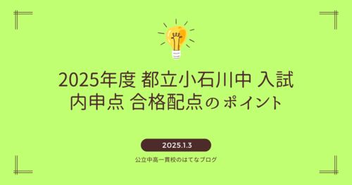 2025年度(令和7年度)の都立中高一貫校受検にあたり、内申点の配点割合から合格可能性を考えたいと思います。 今回は、東京都立小石川中等教育学校について考えてみたいと思います。 都立中受検の内申点は、年度により見直しが行われますが、2025年度(令和…