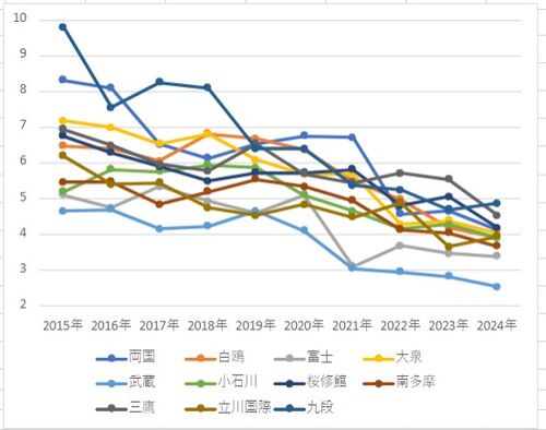 東京都の公立中高一貫校の2015年~2024年までの過去10年間の適性検査受検倍率の推移をグラフにしてみました。 データ分析というにはおこがましいですが、考察してみた結果をレポートします。 目次 2015年~2024年 都立中高一貫校 全11学校別 受検倍率推移(…